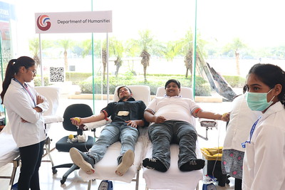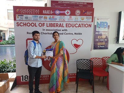 The School of Liberal Education at Galgotias University organized a Blood Donation Camp On 18th October 2023 at University Campus at C-Block Ground Floor in collaboration of Indian Red Cross Society, Gautam Buddha Nagar and Rashtriya Charitable Blood Center Noida to promote a culture of altruism and to contribute to the community's well-being. The blood donation camp had its time from 10:00 am – 4:00 pm. This event aimed to encourage both students and faculty members to participate in this noble cause, thereby reinforcing the values of empathy, social responsibility, and community engagement. The Blood Donation Camp was held at the premises of the School of Liberal Education within the Galgotias University campus. The event was planned and executed meticulously with the assistance of professionals from a reputed local blood bank. The Blood Donation Camp instilled a sense of social responsibility among the students. It provided them with an opportunity to contribute to the well-being of society and help those in need. Through their participation, students learned the importance of giving back to the community. The event encouraged teamwork and camaraderie among students. Many students volunteered to assist in the camp's organization, which helped develop their organizational and leadership skills. The collective effort in setting up and managing the camp created a sense of unity among the students. Blood donation not only benefits the recipient but also the donor. Donating blood helps in regulating blood circulation, reducing the risk of certain diseases, and maintaining a healthy iron level. Students who participated received health benefits in return for their altruistic act.
