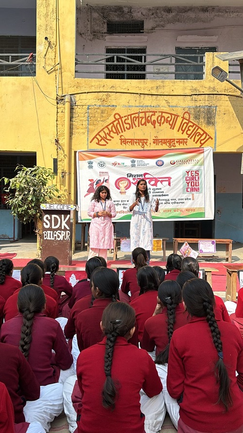 The "Mission Shakti" event, held on November 30, 2024, at S.D. Kanya Inter College, Bilaspur village, Gautam Buddha Nagar, was organized by the National Service Scheme (NSS) Unit-5 and the School of Agriculture, Galgotias University in collaboration with the Ministry of Youth Affairs and Uttar Pradesh Government. The event focused on women's empowerment with the theme "Nari Suraksha, Nari Samman, Nari Swayamblamban" (Women’s Safety, Dignity, and Self-Reliance). The program aimed to spread awareness about gender equality, women’s safety, and self-reliance, while encouraging girls and women to take charge of their lives.