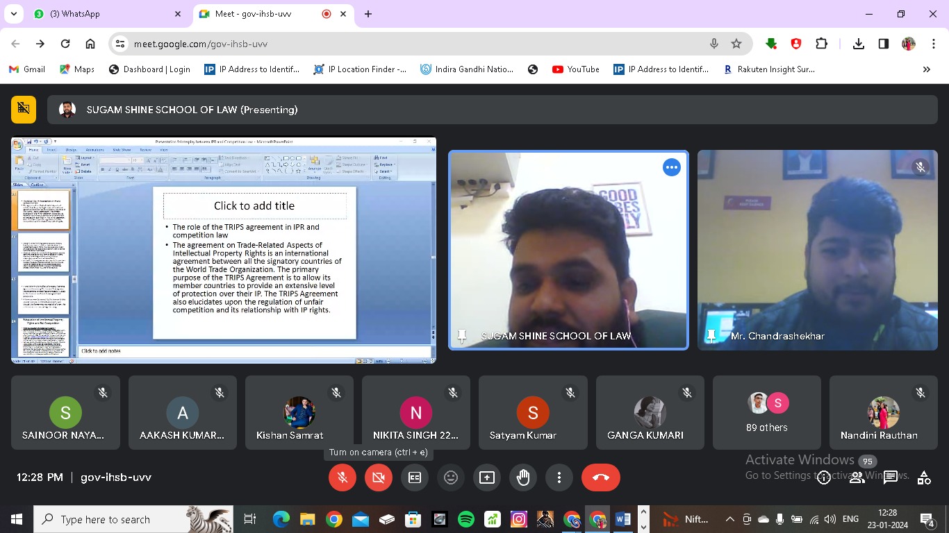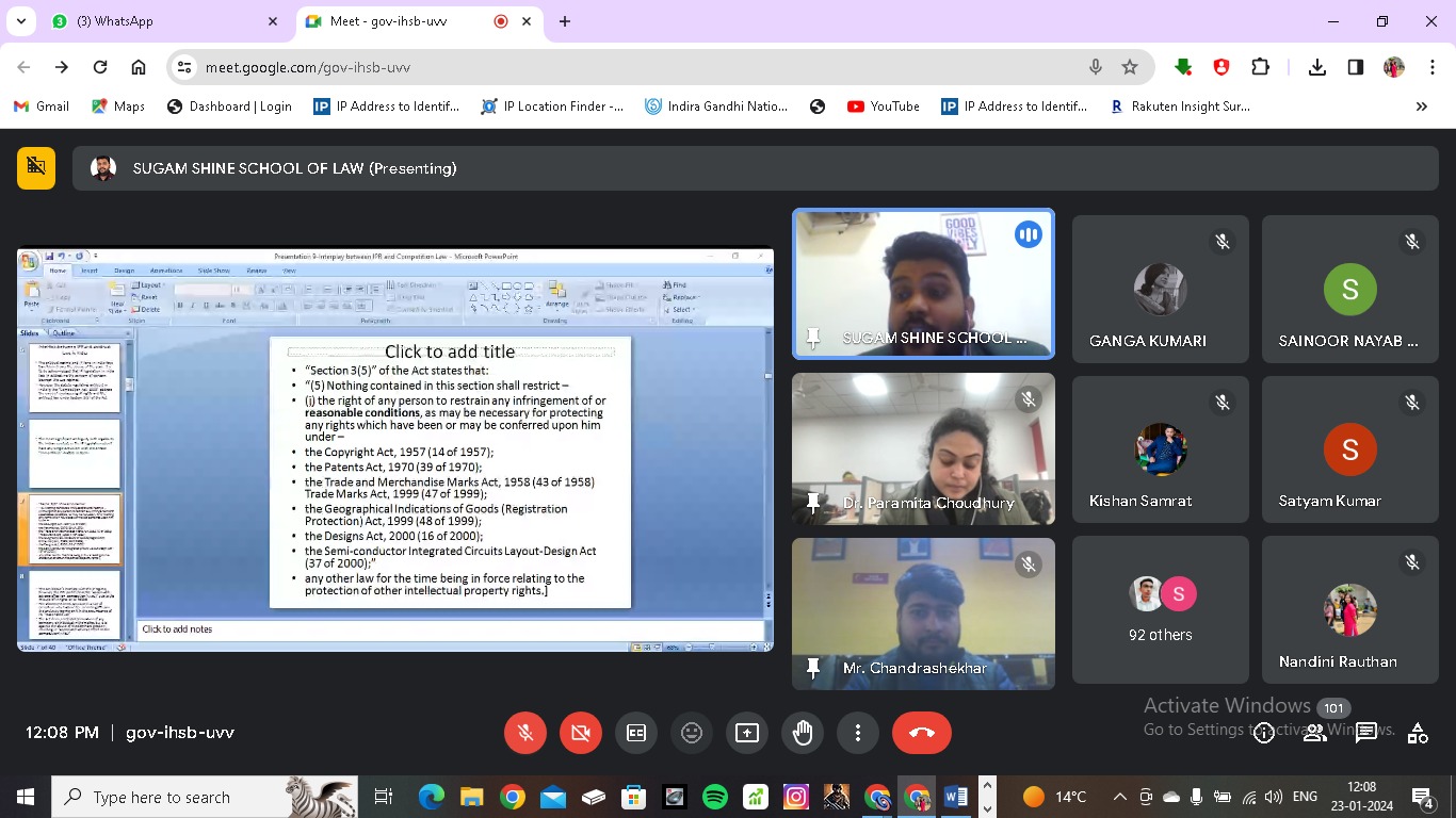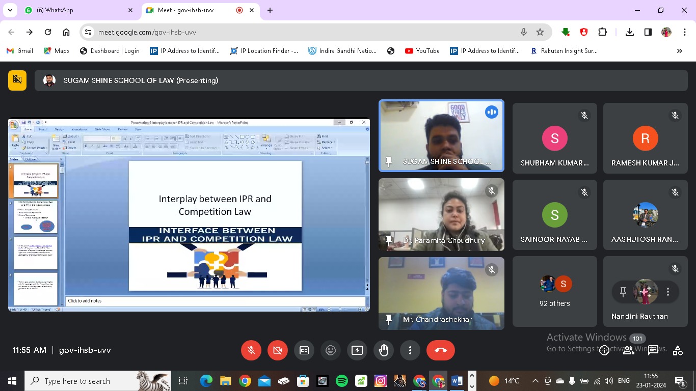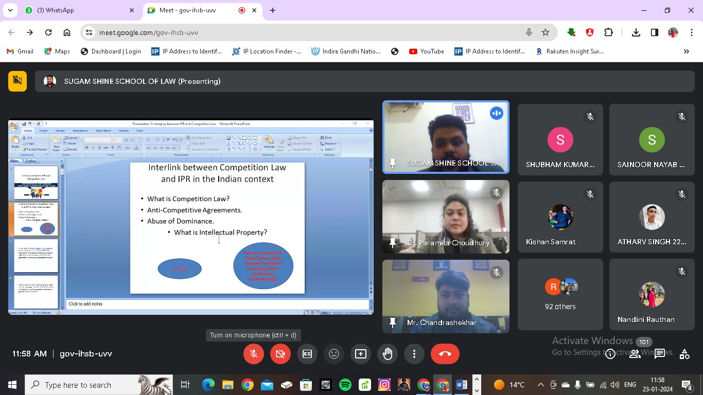 The IPR, Tech, and AI Centre at the School of Law successfully organized an expert talk on the topic “Balancing Acts: Navigating the Intersection of IPR and Competition Law.” The event was conducted online through the Google Meet platform and was attended by students eager to gain insights into the complex relationship between intellectual property rights (IPR) and competition law. The key organizers of the event were Dr Paramita Choudhury (Faculty Convenor, Mr. Chandrashekhar (Faculty Co-convenor) and Ms. Saloni Gupta (Student Convenor). The guest speaker for the event was Mr. Sugam Shine, Assistant Professor at Christ (deemed to be a university). Mr. Shine brought a wealth of experience in the field, making him an ideal speaker to guide students through the intricate aspects of IPR and competition law.