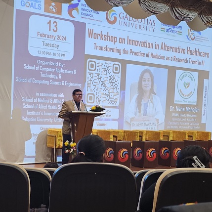 Galgotias University School of computer application and technology, School of pharmacy organized a one day workshop on Innovation in Alternative Healthcare “Transforming the practice of Medicine as a Research Trend in AI “ Power of Ayurveda” on February 13 2024 in New auditoriam C block . The seminar focused on treatment by Ayurveda and Naturopathy. The programme started at 12:30 pm with the Welcome of Dr. Neha Mahajan (MD Green Zone Nature Ayurveda Multispecialty Hospital) . The Seminar was moderated by Dr sudeshna Chakraborty professor School of computer application and technology, Other Co-Coordinators are Ms Neha sharma Assistant Professor School of pharmacy, Dr Gaurav kumar Associate Professor school of applied basic Science, Dr Vineeta Khemchandani Dean ,School of computer application and technology, Professor Dr SK Abdul Rehman, Dean School of pharmacy, Dr. Gaurav Kumar, IIC Head, Galgotias University.