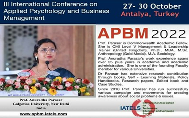 The APBM 2022 – III International Conference on Applied Psychology and Business Management was held on 27th-30th October 2022 in Antalya, Turkey. The conference focused on current trends, theories and practices in psychology, management, behavioral economics, organisational behaviour, social studies and other related disciplines in concern of the national and global goals of the sustainable development.