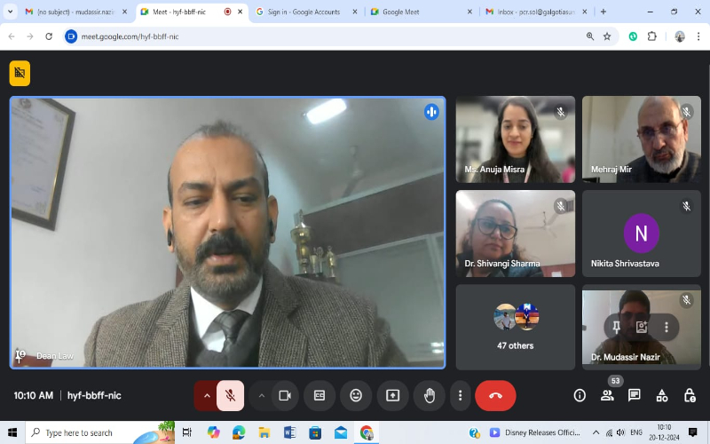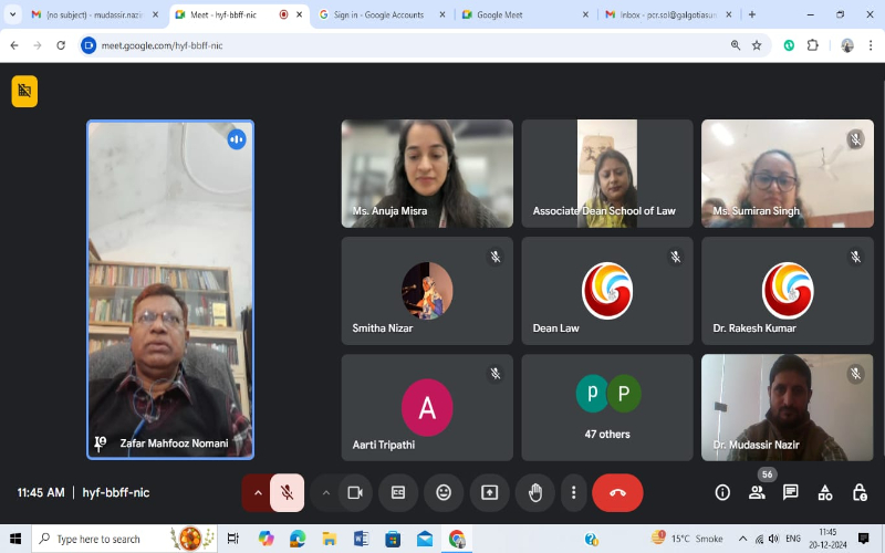 Centre for Post Graduate Legal Studies, Galgotias University’s School of Law organized a one-day online workshop titled “Research Methodology Workshop on Tools and Techniques in Legal Research” on December 20, 2024. The event catered to LL.M and PhD scholars, attracting 70 participants, including law professors and students. The workshop aimed to enhance participants’ understanding of legal research methodologies and tools. The Workshop was supervised by Prof. (Dr.) Shivangi Sharma (PC -LLM), Dr. Mudassir Nazir (PCR), Dr. Anuja Misra, and Dr. Devanshi Singh.