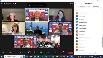 The International Conference was organized on Tuesday, 22 August at the School of Liberal Education, Galgotias University. The theme of the three-day long conference is “Vasudhaiva Kutumbakam For The 21st Century: Re-Visiting Through The Multiple Lenses (The World is One Family)". This conference was organized on the online platform under the celebration of Azaadi ka Amrit Mahotsav. Dr. Mallikarjuna Babu, Vice-Chancellor of the University, Dr. Anuradha Parasar, Dean of the School of Liberal Education, and Chancellor's Advisor of the University Dr. Renu Luthra were present in the inaugural session of the program. Catherine Gavigan, Director of the Center for Wellbeing and Resilience from New Zealand, Roman Babushkin, Minister Counselor from Russia, and Dr. Mitesh Desai, Consultant Physician from the United Kingdom were present in the panel discussion. The session was moderated by Tanuja Vashisht, CEO of Isenex Consulting. Research scholars presented their research papers in the paper presentation session of the conference. The session was presided over by Dr. Arvind Agarwal, Vice Chancellor of Nirwan University. Paramveer Singh, Suresh Ghatge, Sania Ulhas, Jyoti Singh, and Nangsangulya Imchen presented their research papers. The fourth session's panel discussion included David Keeney, CEO of Aurigo from the United Kingdom, Niaz Waris, Executive Director of Daiichi Trading Company, Japan, and Germano Schwartz, CEO of the Caxias University Foundation Germany. Professors and other scholars from Turkey, Greece, Netherlands, Nigeria, Thailand, Israel, Taiwan, Iran, Russia, Chile, Dharamshala (Tibetan), Singapore, Saudi Arabia, USA, United Arab Emirates, Zimbabwe, Mongolia, Brazil, Bangladesh, and Dubai had also participated in this conference.