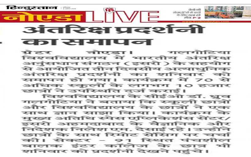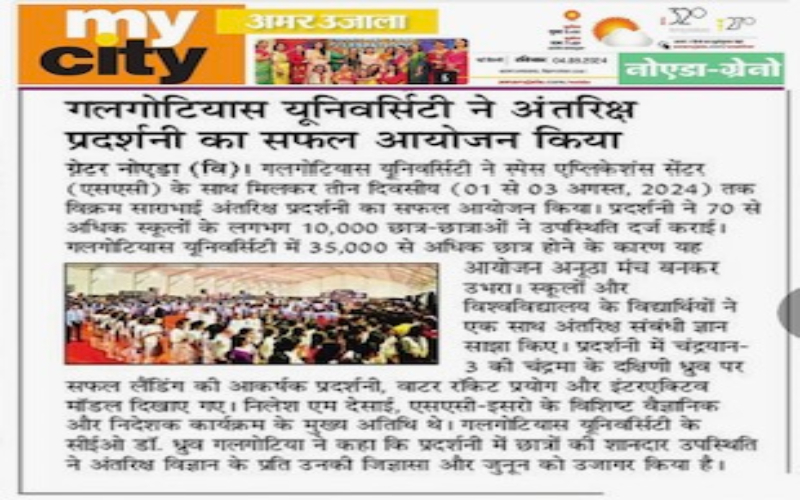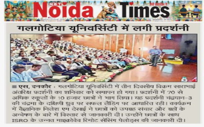 Vikram Sarabhai Space Science Exhibition, held over three days, from 1st August to 3rd August 2024 at Galgotias University, Greater Noida, proved to be a monumental success, attracting nearly 10000+ students in three days. The event aimed to ignite interest in space science among young learners and provide a platform for interactive and educational experiences. This is really an exceptional initiative as a part of The National Space Day Celebrations 2024.